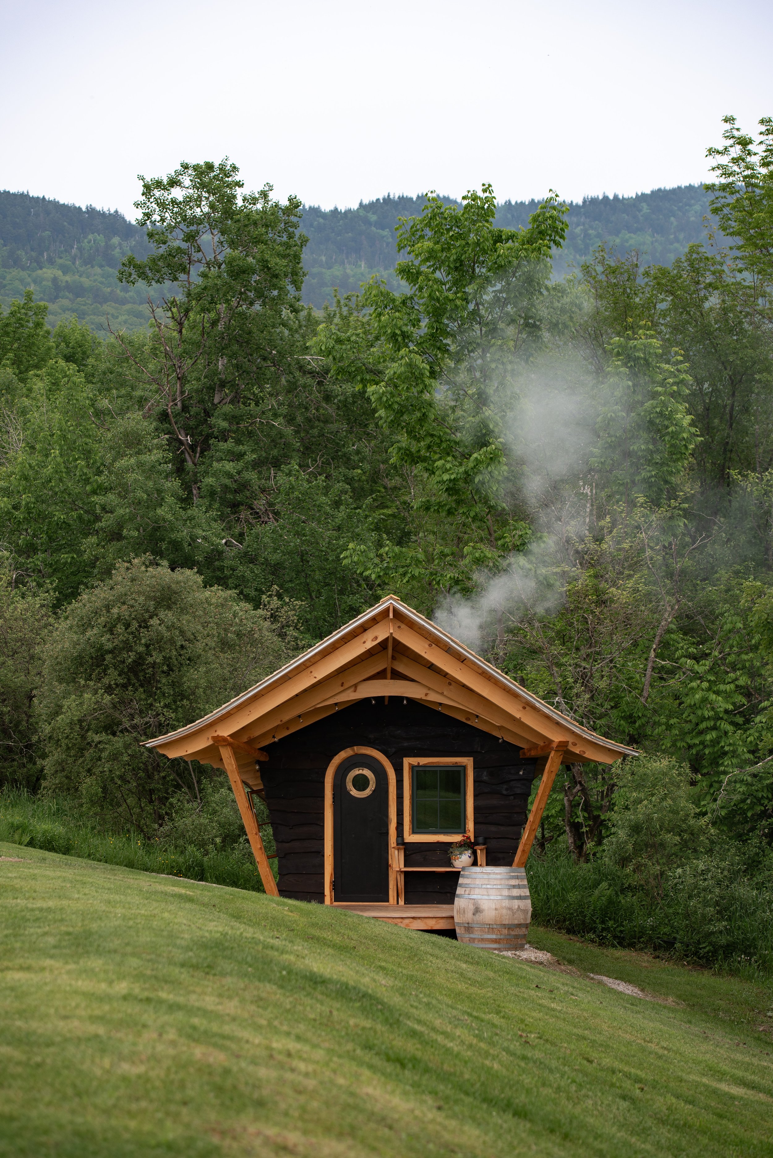 Our artisan crafted, wood-fired, cedar sauna is one-of-a kind. Sloped walls offer comfortable seating for up to 10 guests, while hot rocks and a Scandanavian stove offer the ultimate ambiance. Set adjacent to our artesian well-fed swimming pond, the views are of course unmatched, and the porch hosts a large cedar barrel cold plunge tub that flows from the artesian well year-round and stays between 40 and 55 degrees.